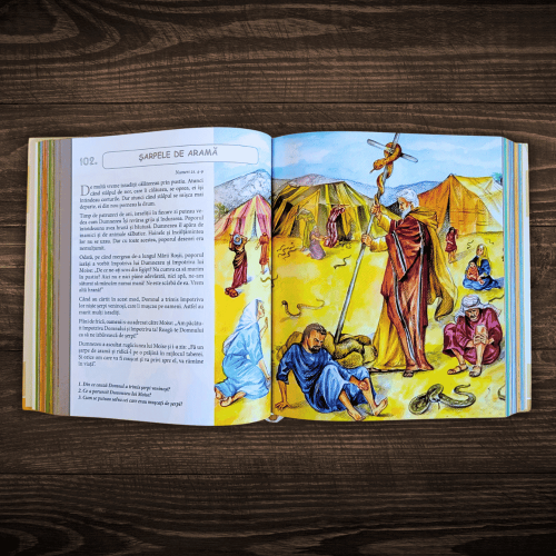 - Ilustrații colorate și detaliate – fiecare poveste prinde viață prin imagini atractive care îi ajută pe copii să înțeleagă mai bine mesajul biblic.
