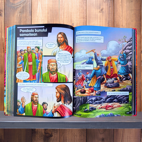Aceasta nu este o simplă carte biblică pentru copii. Este Biblia în benzi desenate, o călătorie grafică uimitoare prin cele mai epice aventuri din Scriptură. Cu peste 150 de povești captivante, fiecare pagină pulsează de acțiune, emoție și revelație divină. Copiii nu vor mai dori să lase cartea din mână!