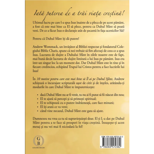 În concluzie, "10 motive pentru care este mai bine să Îl ai pe Duhul Sfânt" este o lectură esențială pentru oricine dorește să aprofundeze misterul și frumusețea relației cu Dumnezeu. Este o carte care te va provoca, te va inspira și te va echipa să trăiești o viață în plină comuniune cu Duhul Sfânt. Nu rata ocazia de a descoperi aceste adevăruri transformatoare și de a experimenta o relație mai profundă și mai îmbogățitoare cu Dumnezeu.