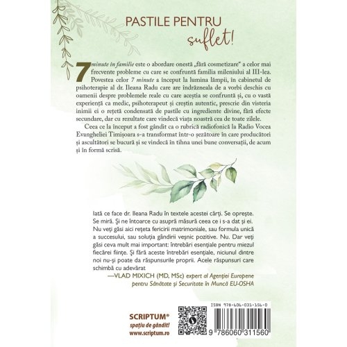 Cu o vasta experienta tridimensionala, Ileana Radu ne prescrie din vistieria inimii cea mai pretioasa reteta condensata in 7 minute in familie. Innobilata cu ingrediente divine, fara efecte secundare, fiecare tableta trateaza semiotic familia secolului XXI in toate aspectele ei. Pentru o viata sanatoasa, cititi cu inima buna pe tot parcursul zilei, iar rezultatele nu vor intarzia sa apara!
