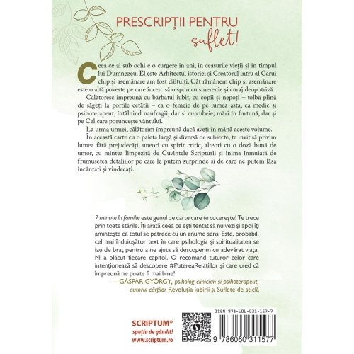 Pachetul 7 minute in familie contine: • Volumul 1: Viata noastra cea de toate zilele (274 pagini) • Volumul 2: Ceasurile vietii si timpul lui Dumenzeu (208 pagini), imagini color si un link pentru o selectie de meditatii traduse in limba engleza.