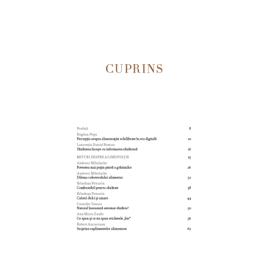 „Dacă suntem ceea ce mâncăm, poate că n-ar fi rău să înțelegem câte ceva despre nutriție. Eu am primit de-a gata câteva idei despre alimente și sănătate, iar mai târziu am ajuns să mi le schimb. Dacă mai sunt și alții care au primit idei de-a gata (și cred că nu sunt puțini), această carte le va fi de folos.”