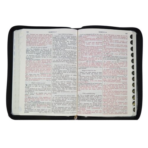 Materialele auxiliare includ o concordanță biblică de 53 de pagini și un index de căutare rapidă a cărților bibliei. Caracteristicile exterioare impresionează prin coperta din piele naturală, marginile albe, fermoarul care protejează paginile și indexul pentru o accesibilitate ușoară. Această Biblie este o resursă completă și valoroasă pentru cei care doresc să exploreze și să înțeleagă învățăturile religioase, cu un design exterior elegant și caracteristici interioare bine concepute pentru o experiență de lectură profundă și personală.