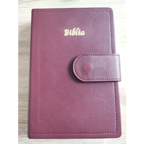 [ANTICARIAT] - Biblia marime medie, vișiniu, piele, inchidere baretă cu capsă, margini aurii, index, cuv. lui Isus cu rosu [MAR 057 PBI](Produs cu defect)