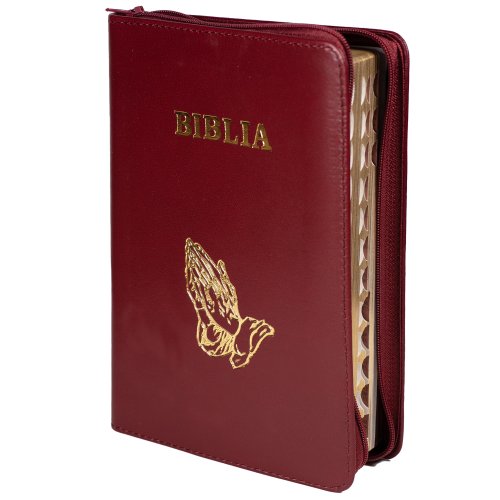 [ANTICARIAT]Biblie din piele, marime medie, vișiniu, fermoar, index, margini aurii, simbol maini in rugaciune, cuv. lui Isus cu rosu [SB 057 PFI](Produs cu defect - urme de uzura pe coperta)