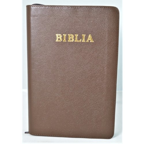 [ANTICARIAT] Biblie mare, piele, culoare maro, fermoar, index, margini argintii, simbol simpla, cuv. Isus cu rosu [SI 073 PFI] (Produs cu defect)