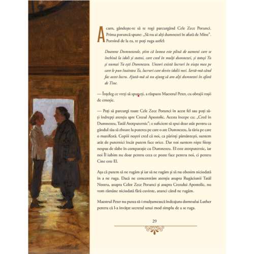 Marele reformator îl va învata pe barbier o metoda simpla, una care are la baza rugaciunea „Tatal nostru”, „Cele zece porunci” si „Crezul Apostolic”. La finalul cartii, copiii si adultii deopotriva, vor gasi aceste trei texte, recomandate de dr. Luther pentru a începe o viata de rugaciune profunda.