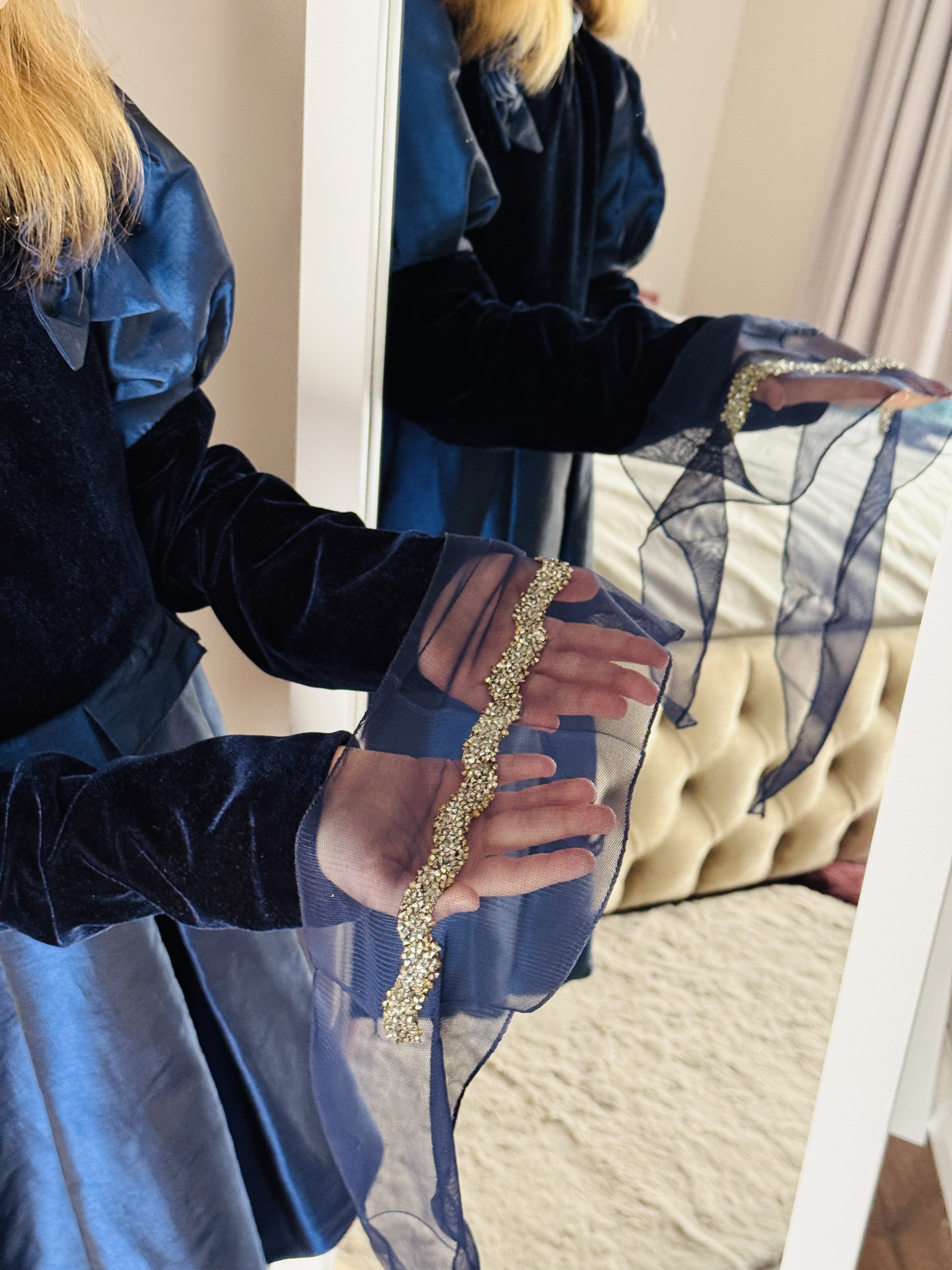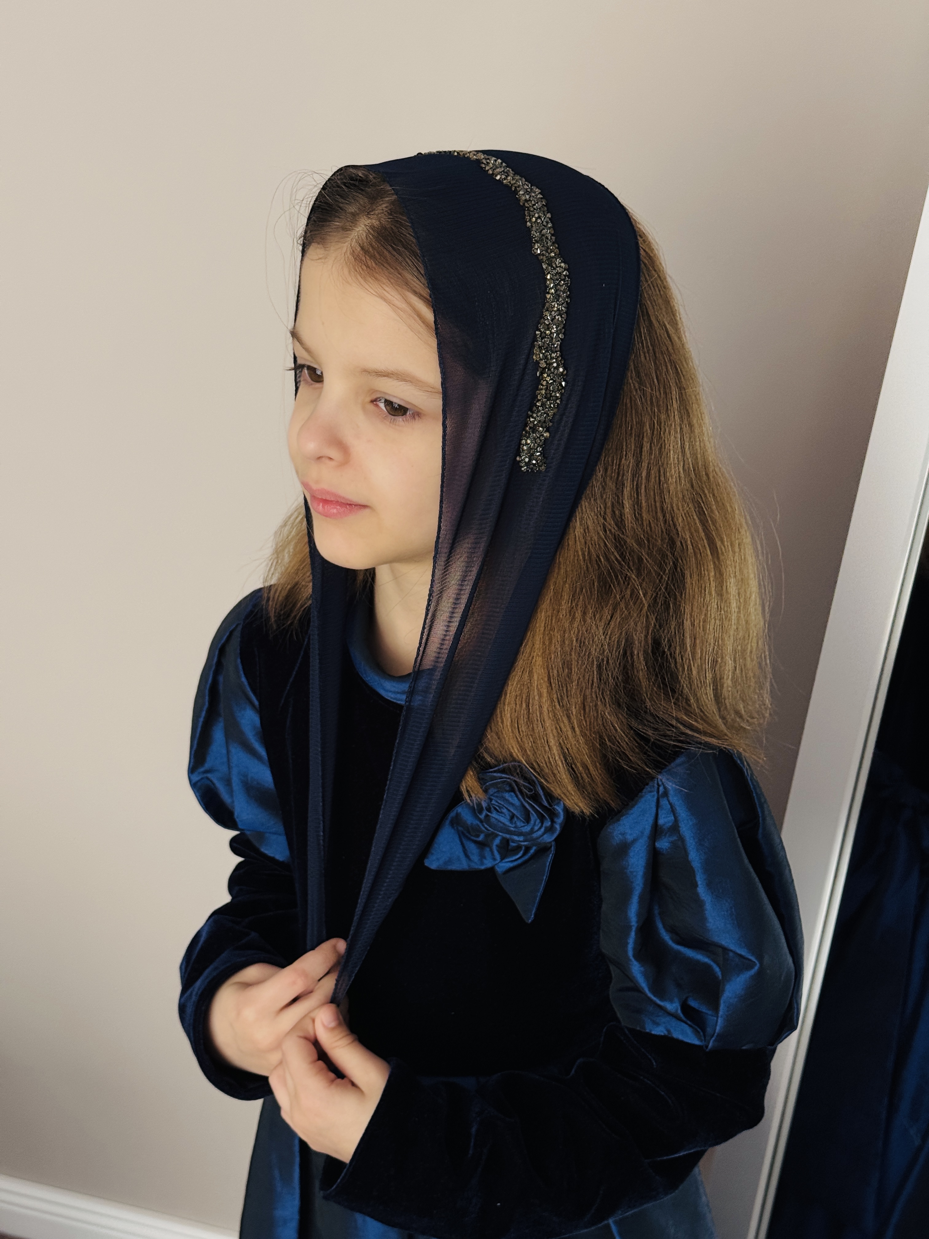 Bentiță din tul - albastra inchis cu pietre maro
