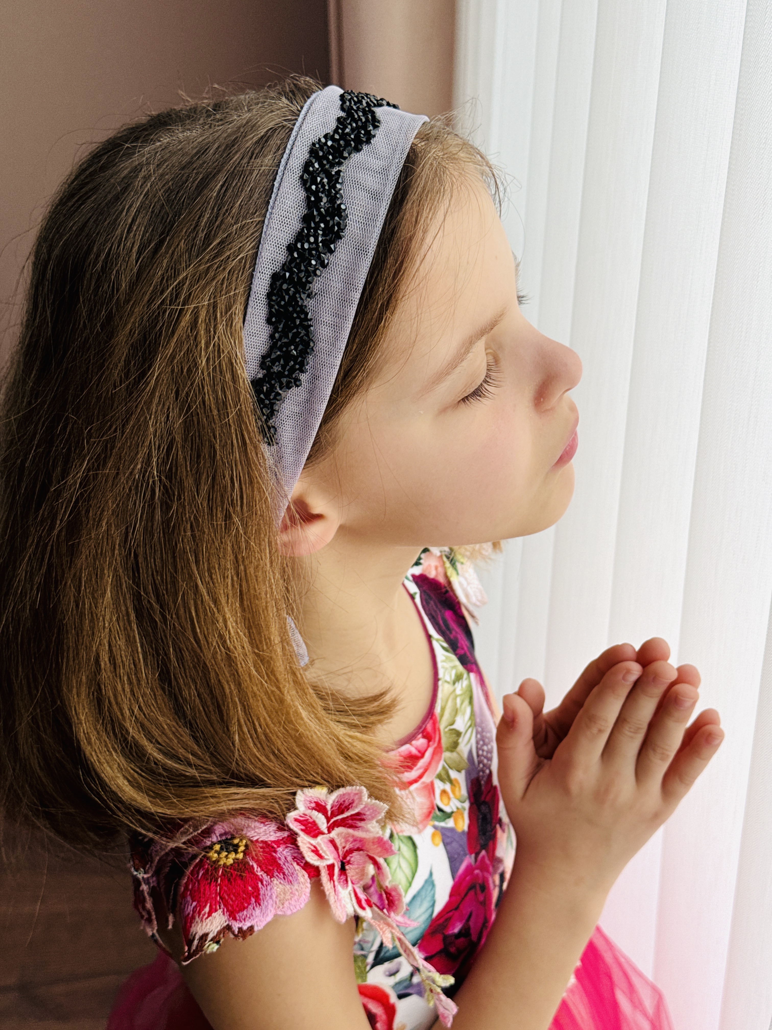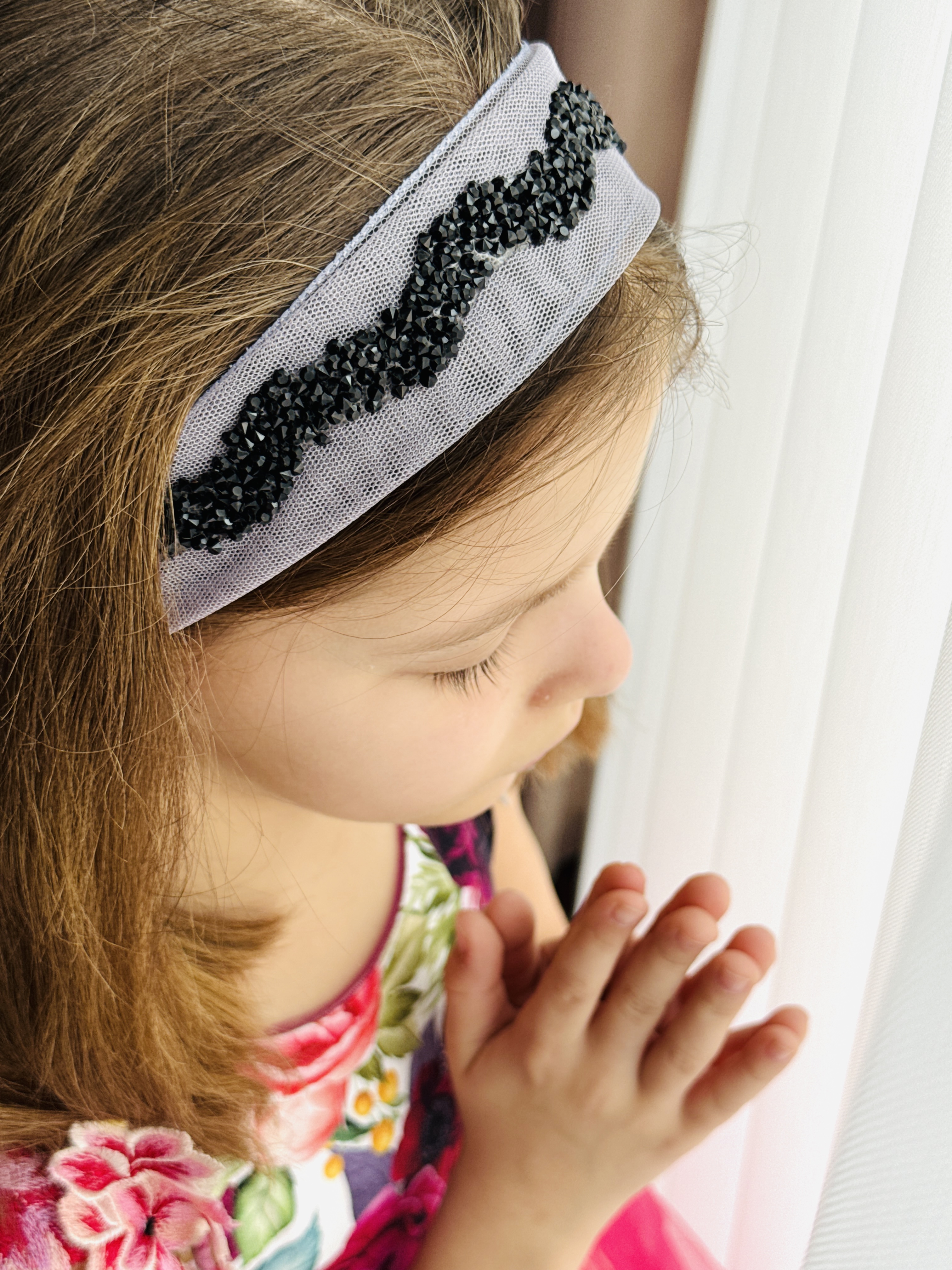 Bentiță din tul - gri cu pietre negre