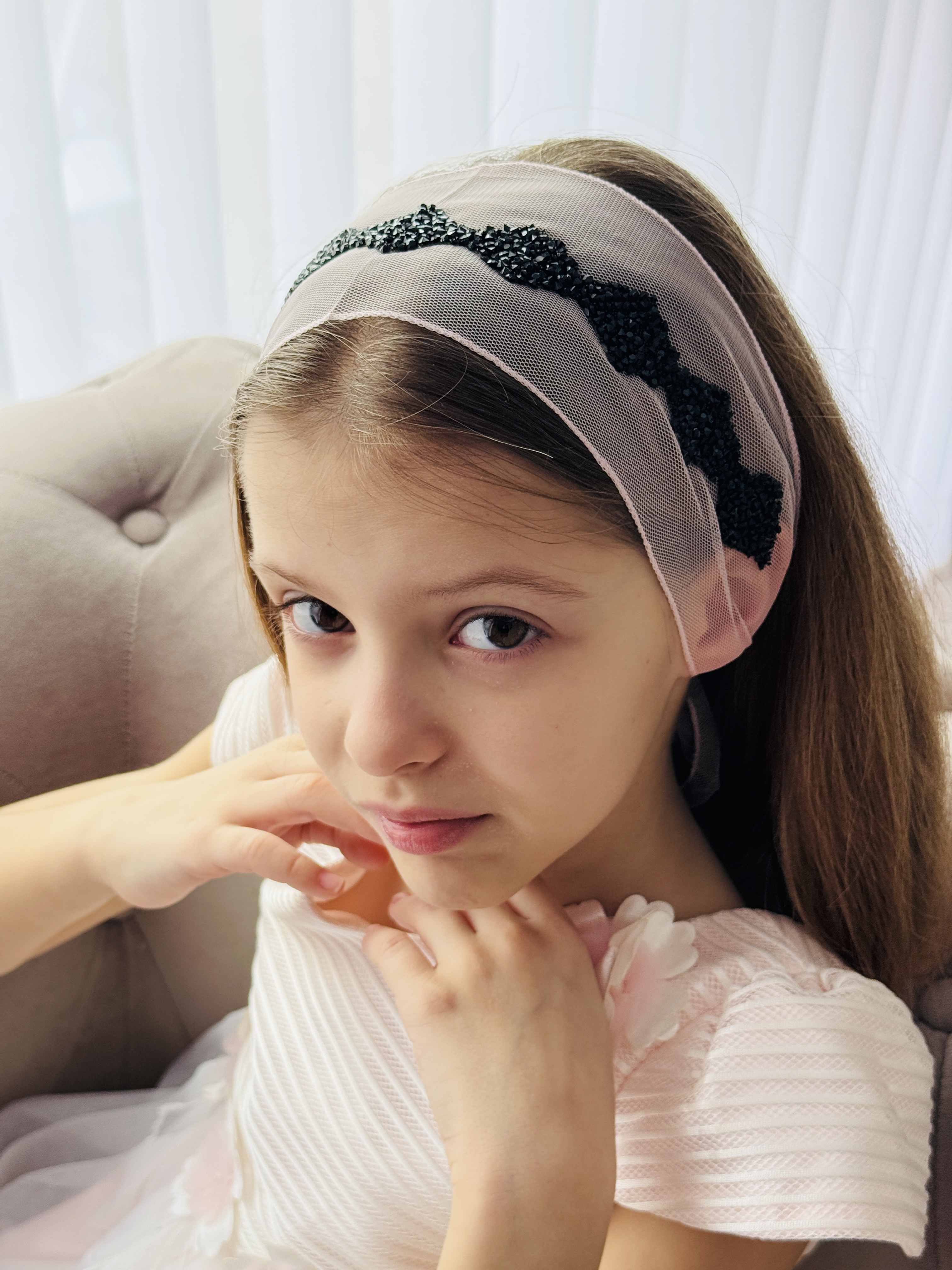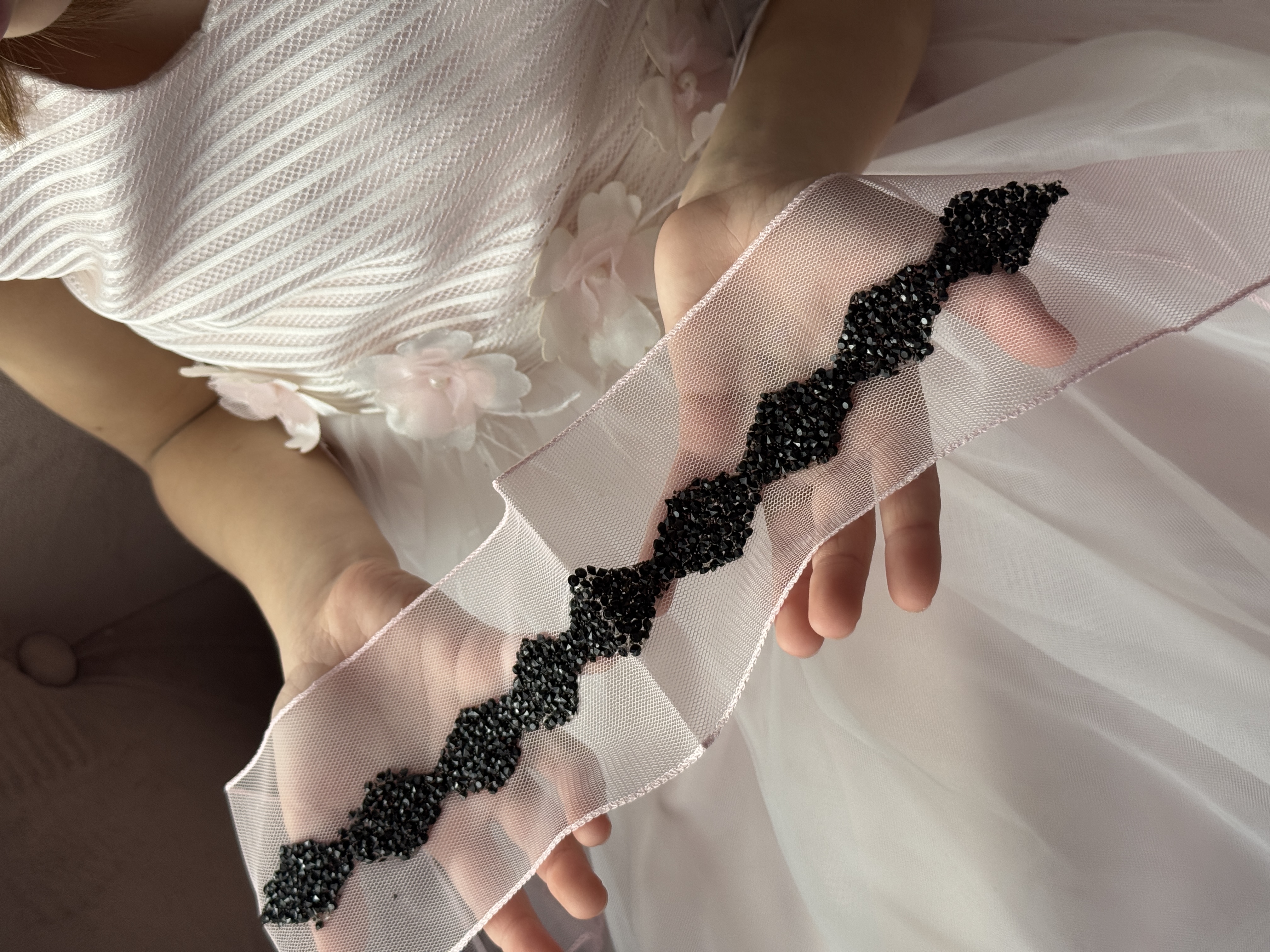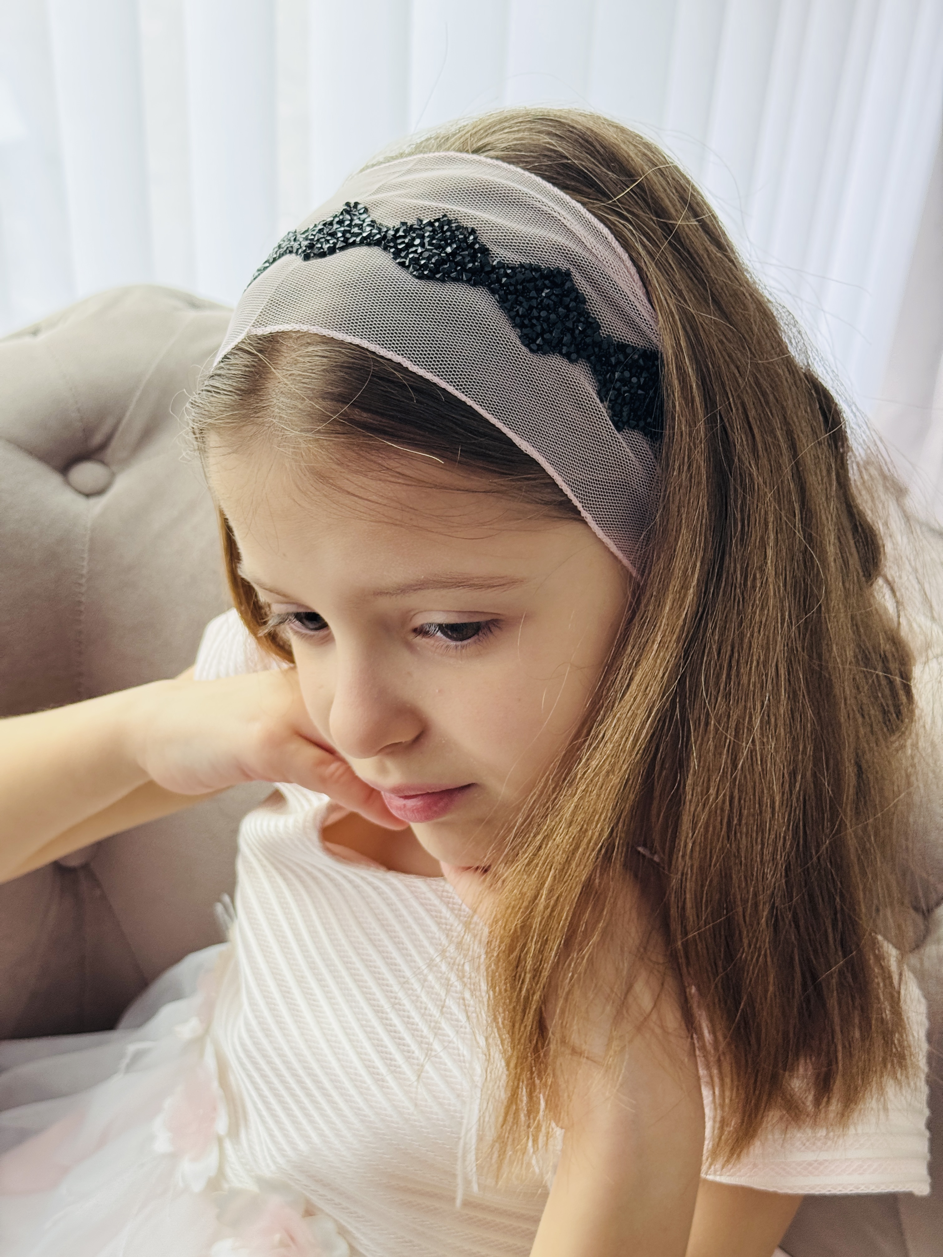 Bentiță din tul - roz pal cu pietre negre