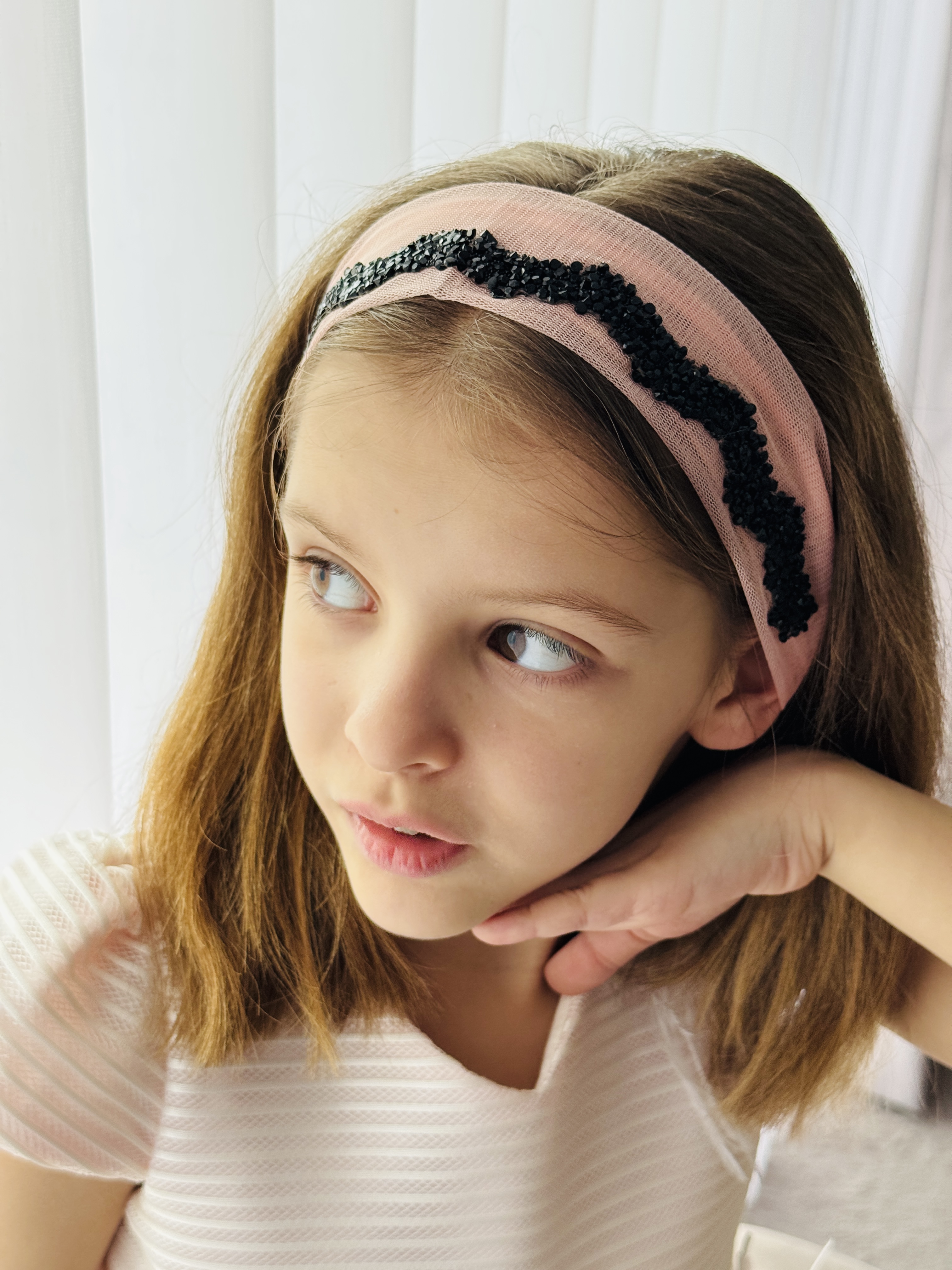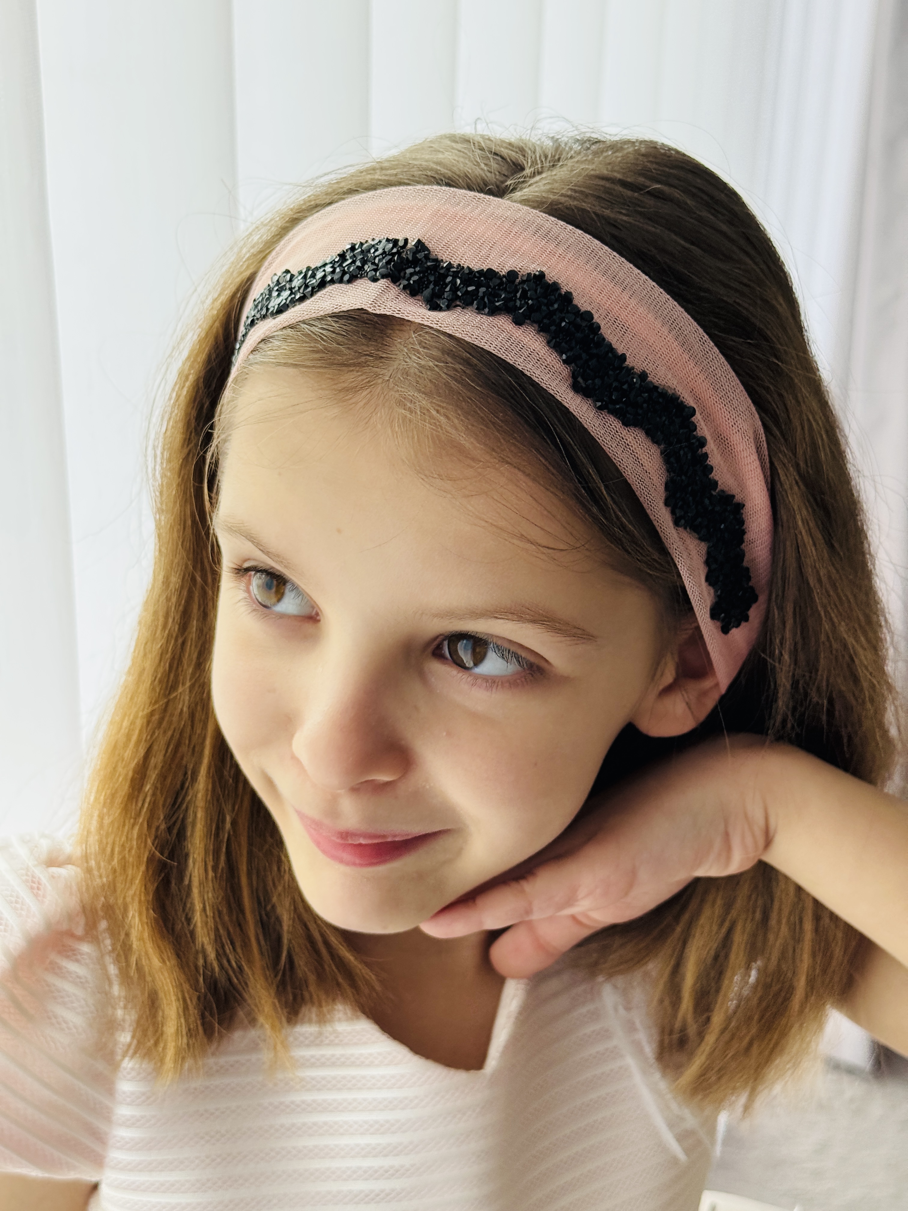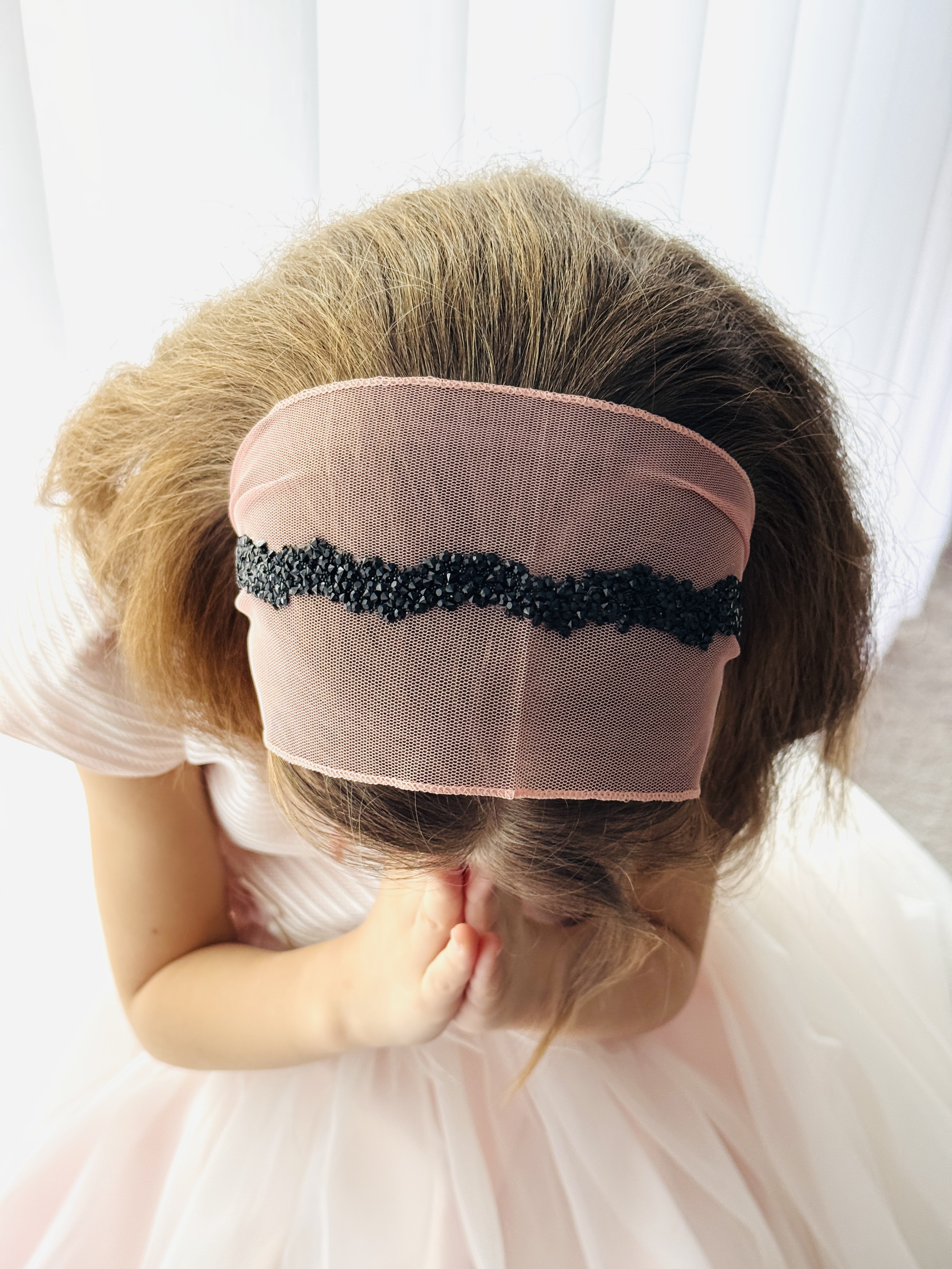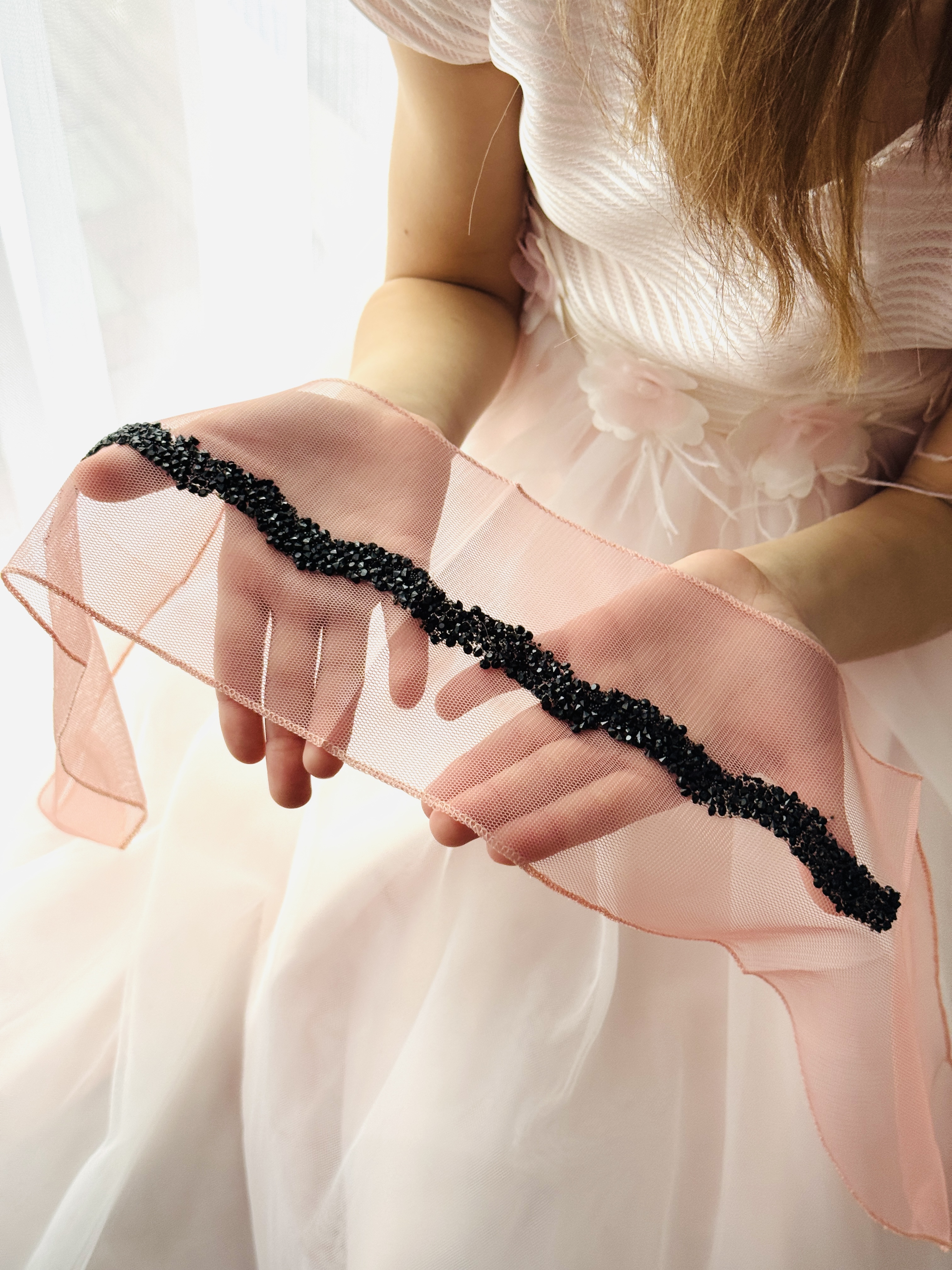 Bentiță din tul - somon pal cu pietre negre