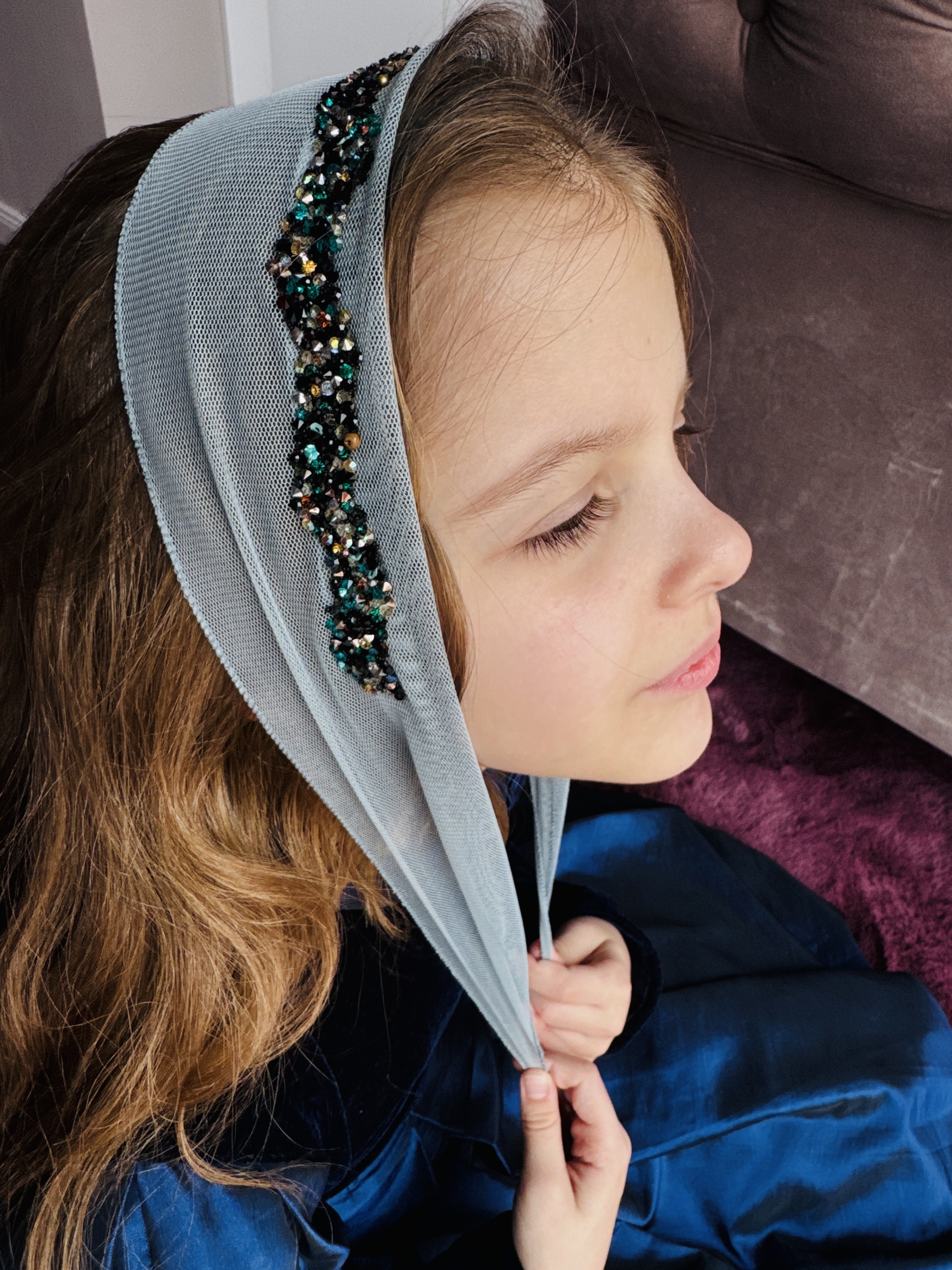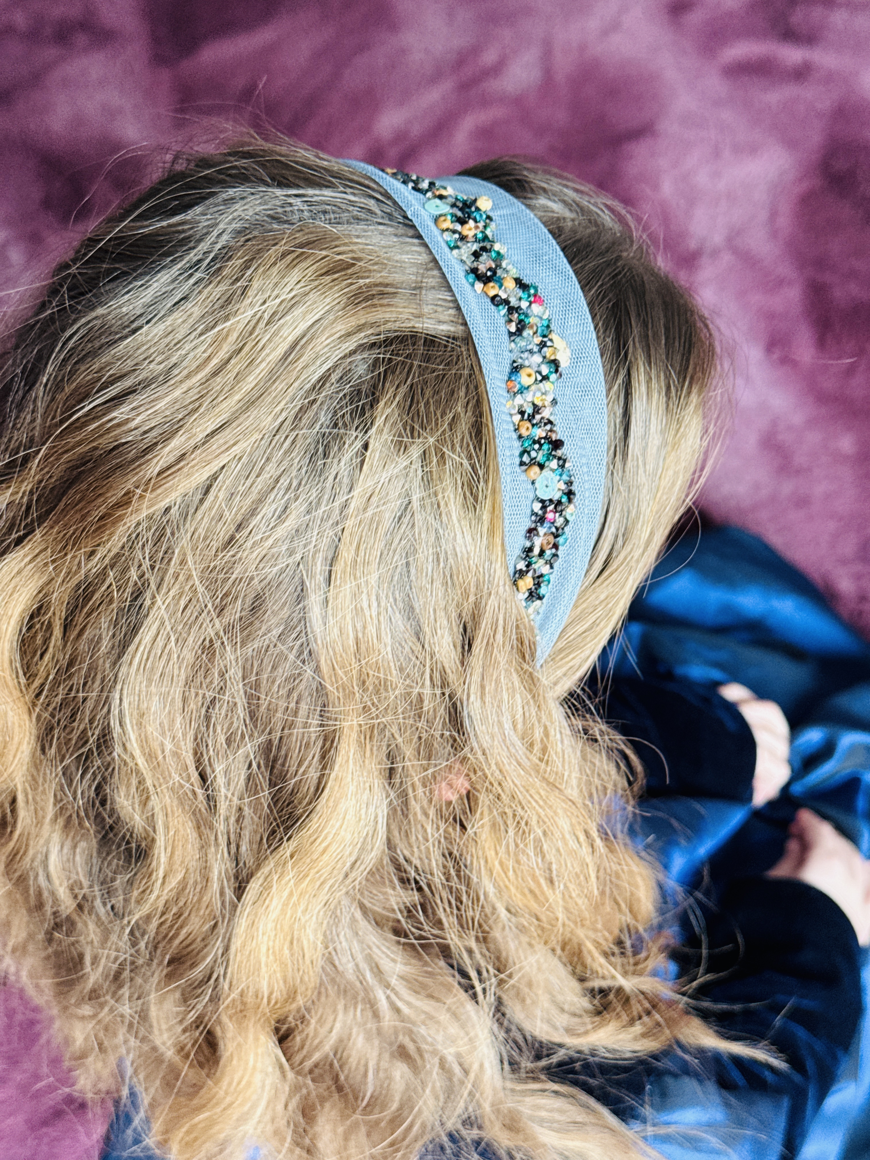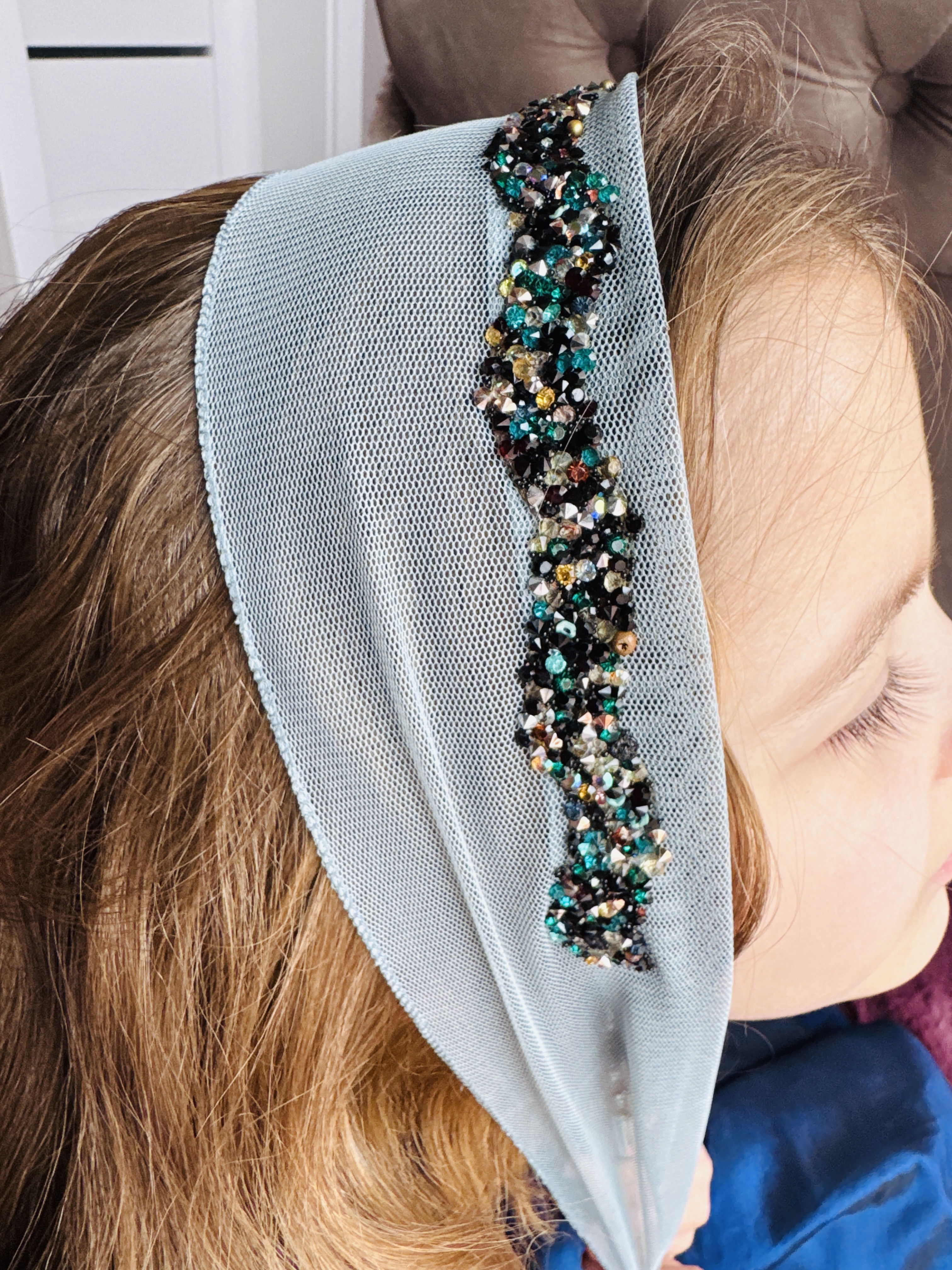 Bentiță din tul - turcoaz pal cu pietre si paete colorate