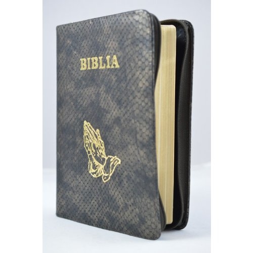 Biblia din piele, marime medie, maro inchis, imprimeu piele sarpe, cu maini, fermoar, margini aurii, cuv. lui Isus cu rosu [052]