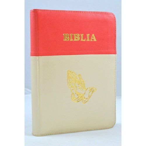 Biblia din piele, marime medie, rosu coral - bej deschis, fermoar, simbol maini, cuv. lui Isus cu rosu [053]