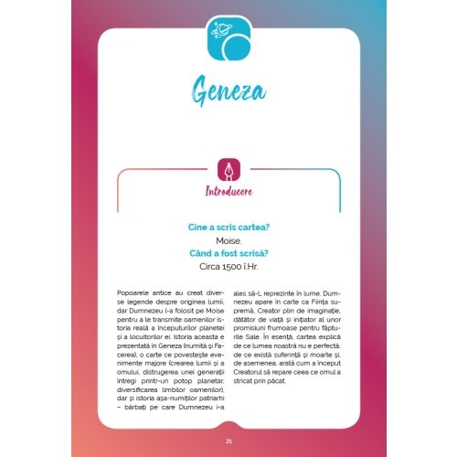 Informațiile din istorie, arheologie biblică și arte îmbogățesc cunoștințele tinerilor. Portretele biblice le oferă exemple de „așa da” și „așa nu” din istoriile unora dintre cele mai cunoscute personaje din Biblie. Sugestiile de transpunere a principiilor biblice în acțiuni și fapte concrete îi ajută să descopere Scripturile ca sursă a unei religii practice.