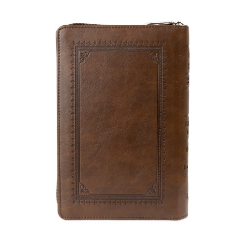 Biblia bilingva engleză-română, marime medie, piele ecologica, maro, fermoar, index, margini aurii, cuv. lui Isus cu rosu