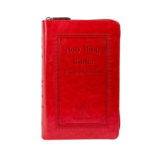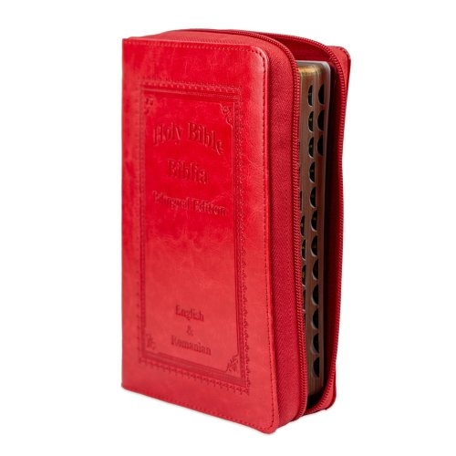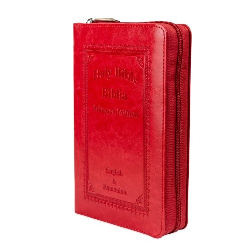Biblia bilingva engleză-română, marime medie, piele ecologica, rosie, fermoar, index, margini aurii, cuv. lui Isus cu rosu