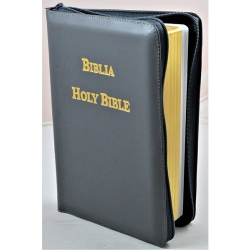 Biblia bilingva [engleza-romana], piele, gri, aurita, simbol maini, cuv. lui Isus cu rosu