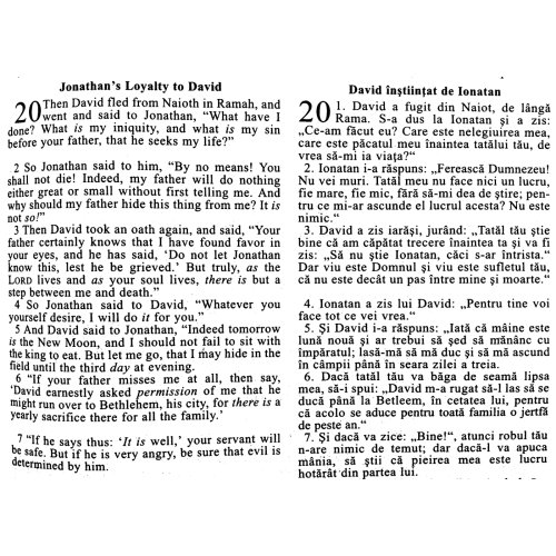Biblia bilingva [engleza-romana], piele, neagra, aurita, simbol maini, cuv. lui Isus cu rosu