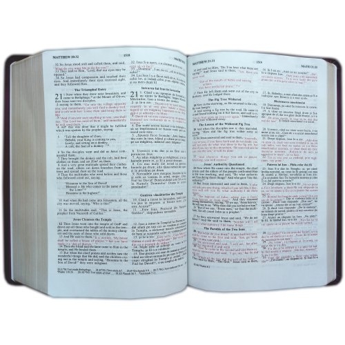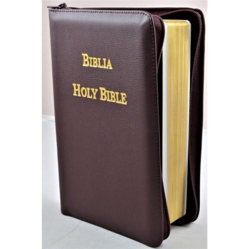 Biblia bilingva [engleza-romana], piele, visiniu, aurita, simbol maini, cuv. lui Isus cu rosu