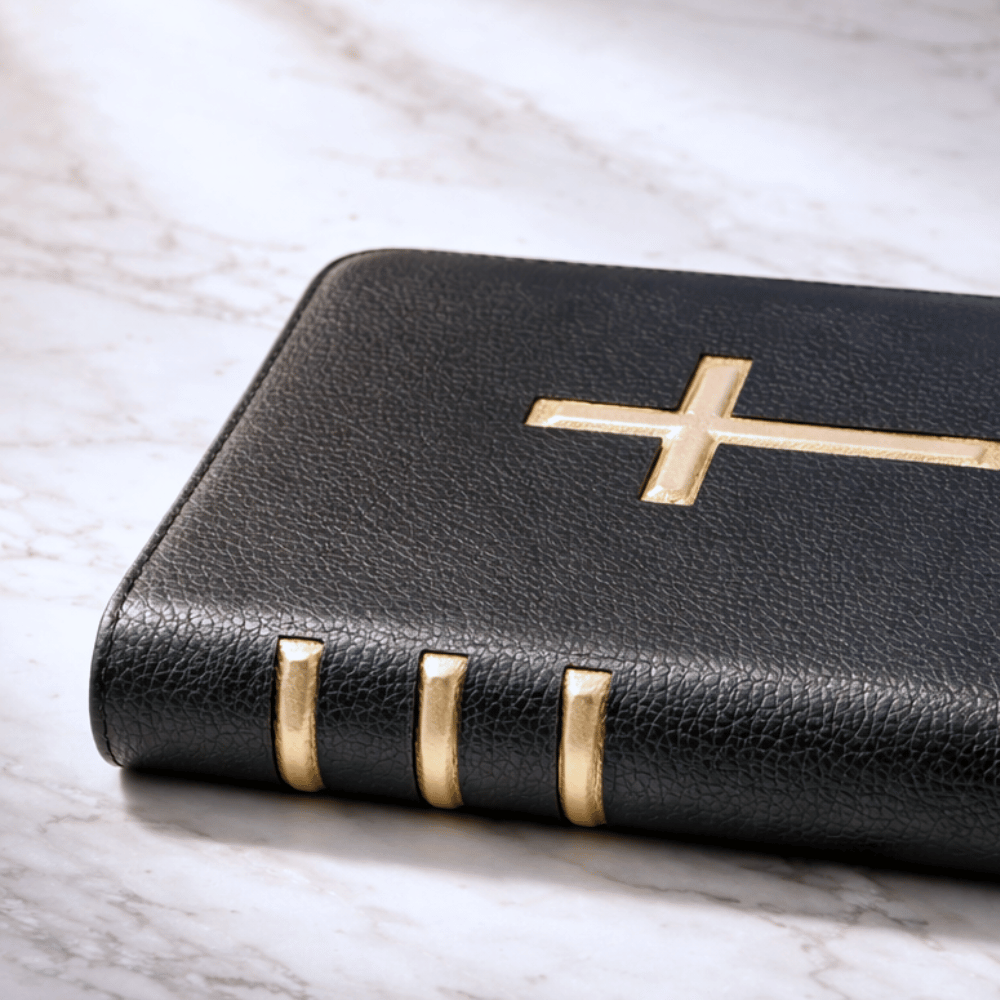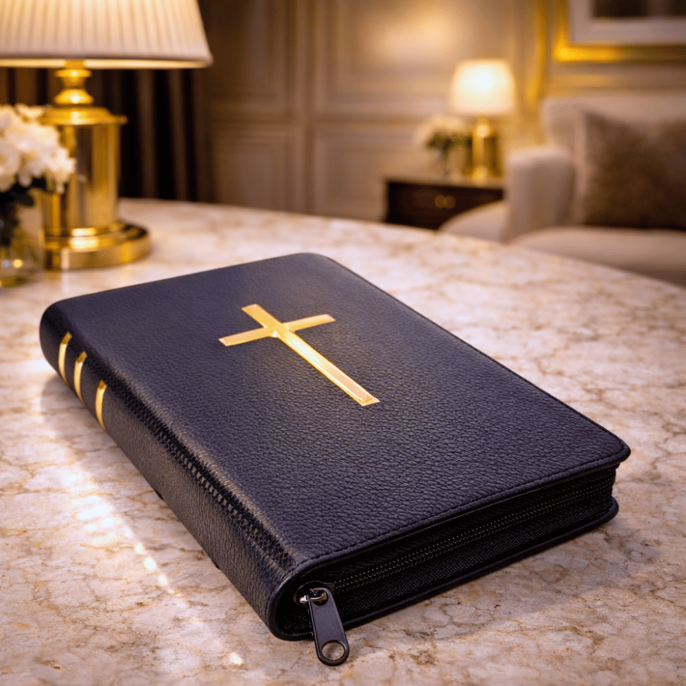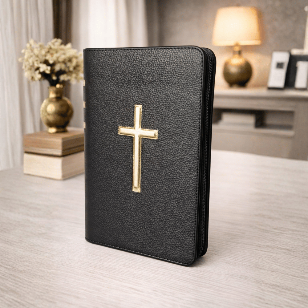 Biblia coperta editie limitata, piele neagra, medie, fermoar, index, aurita, simbol cruce auriu, cuv. lui Isus cu rosu [057 PFI]