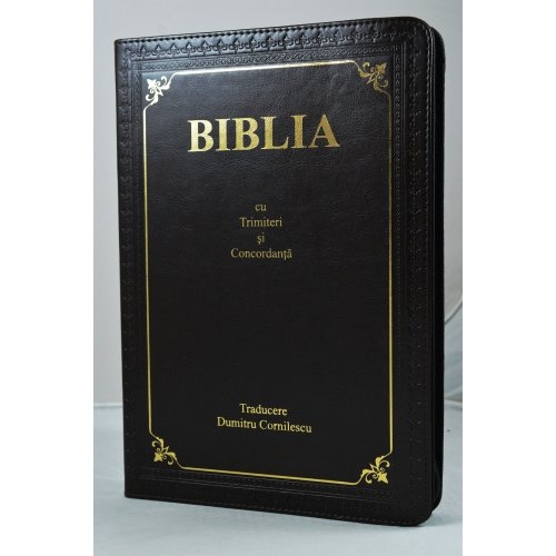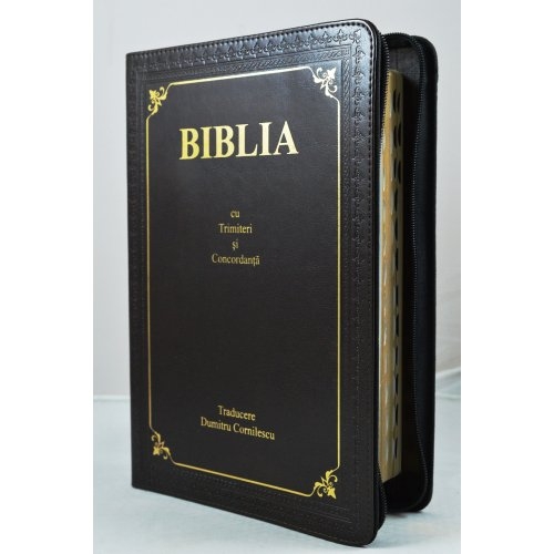 Biblia cu concordanta, mare, scris foarte mare, piele, maro brun, fermoar, index, cuv. lui Isus cu rosu [083 ZTI]
