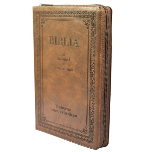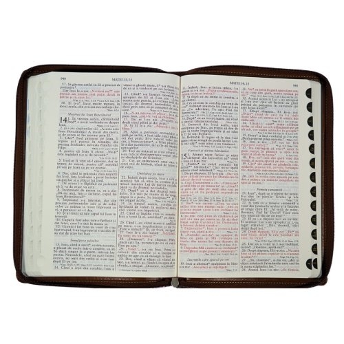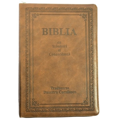 Biblia cu concordanta, mare, scris foarte mare, piele ecologica, maro, fermoar, index, margini albe, cuv. lui Isus in rosu [083 ZTI]