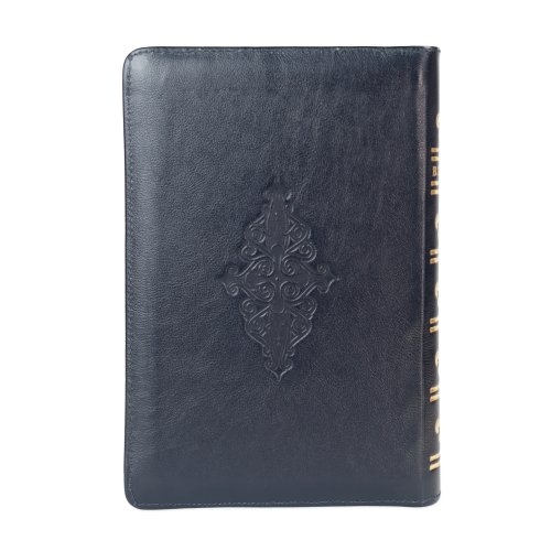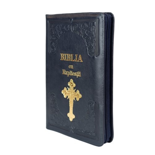 Biblia cu concordanta si explicatii, coperta piele HANDMADE, mare, culoare bleumarin închis, fermoar, index, margini aurii, simbol cruce , cuv. lui Isus cu rosu [CO 77 HMI]