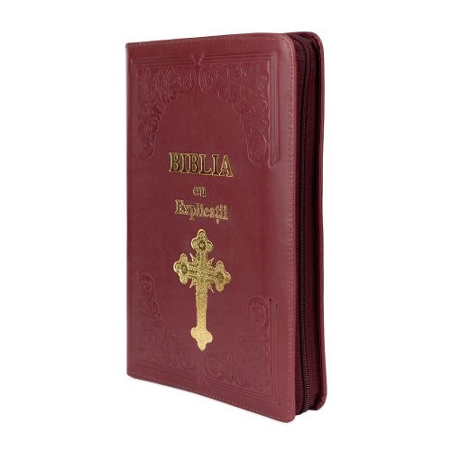 Biblia cu concordanta si explicatii, coperta piele HANDMADE, mare, culoare bordo, fermoar, index, margini aurii, simbol cruce , cuv. lui Isus cu rosu [CO 77 HMI]