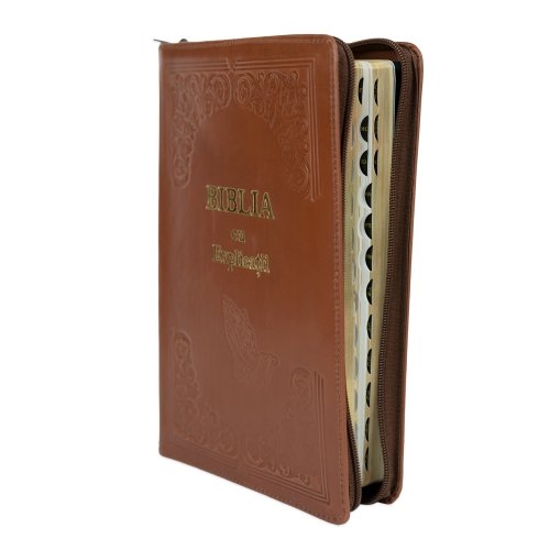 Biblia cu concordanta si explicatii, coperta piele HANDMADE, mare, culoare maro, fermoar, index, margini aurii, maini in ruga, cuv. lui Isus cu rosu [CO 77 HMI]