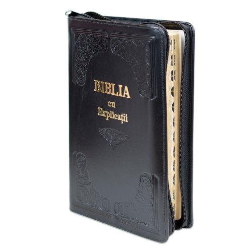 Biblia cu concordanta si explicatii, coperta piele HANDMADE, mare, culoare neagra, fermoar, index, margini aurii, cuv. lui Isus cu rosu [CO 77 HMI]