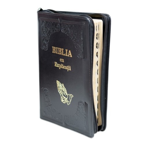 Biblia cu concordanta si explicatii, coperta piele HANDMADE, mare, culoare neagra, fermoar, index, margini aurii, maini in ruga, cuv. lui Isus cu rosu [CO 77 HMI]