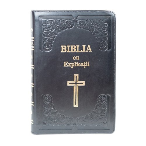 Biblia cu concordanta si explicatii, coperta piele HANDMADE, mare, culoare neagra, fermoar, index, margini aurii, simbol cruce 2, cuv. lui Isus cu rosu [CO 77 HMI]