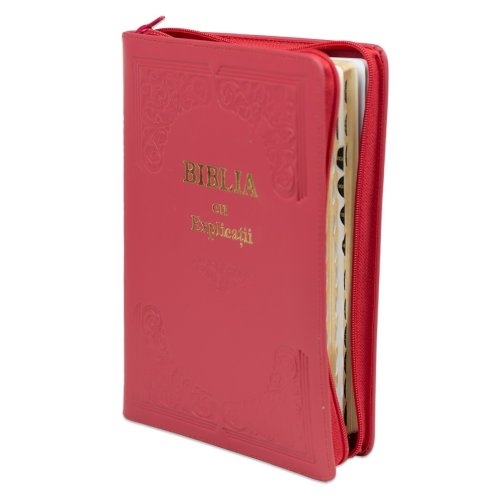 Biblia cu concordanta si explicatii, coperta piele HANDMADE, mare, culoare roz, fermoar, index, margini aurii, cuv. lui Isus cu rosu [CO 77 HMI]