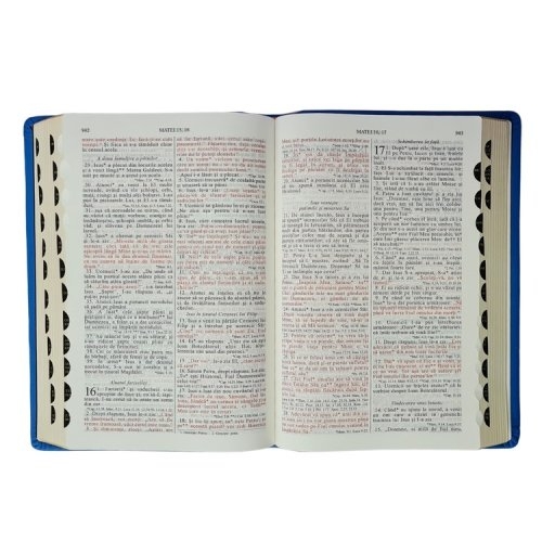 - Finisaje: index de căutare rapidă a cărților biblice (repertoar), margini aurii, fără fermoar