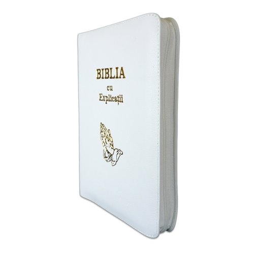 Biblia cu explicatii + concordanta biblica, piele naturala, culoare alba, fermoar, index, margini aurii, simbol maini in rugaciune, cuv. lui Isus cu rosu [CO 77 PFI]