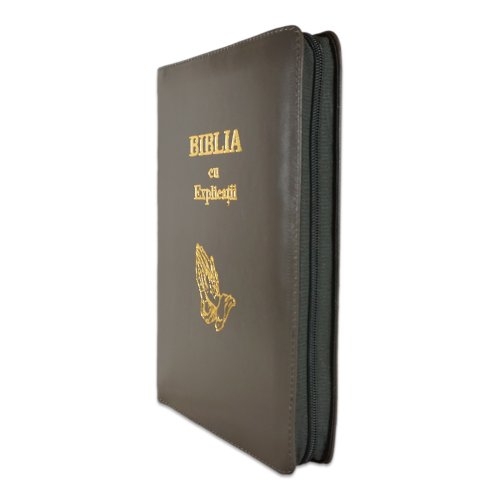 Biblia cu explicatii + concordanta biblica, piele naturala, culoare gri, fermoar, index, margini aurii, cuv. lui Isus cu rosu, simbol maini in rugaciune [CO 77 PFI]