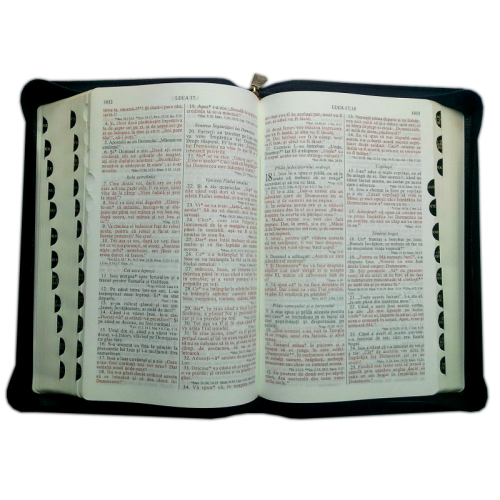 - Finisaje: index de căutare rapidă a cărților biblice (repertoar), margini aurii, cu fermoar