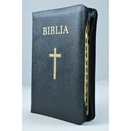 Biblia marime medie, din piele, neagra, fermoar, index, margini aurii, cu cruce [063 PFI]