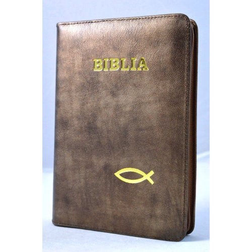 Biblia de piele, marime medie, nuante de maro, margini aurii, simbol peste, cuv. lui Isus cu rosu [052]