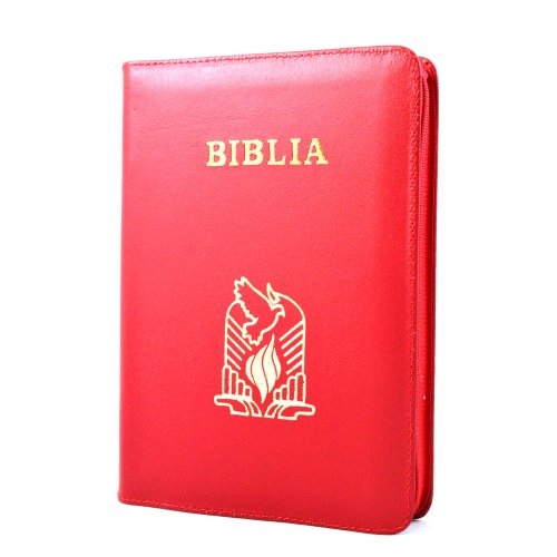 Biblia de piele, marime medie, rosie, margini aurii, simbol porumbel, cuv. lui Isus cu rosu [052]