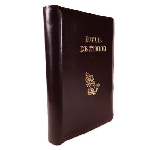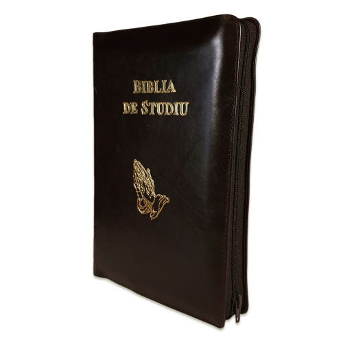 Biblia de studiu Andrews, explicatii+concordanta+harti, mare, coperta piele, culoare maro inchis, fermoar, simbol maini in rugaciune