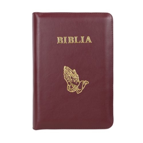 Biblia de studiu pentru femei, piele, marime medie, culoare vișiniu închis, fermoar, simbol mâini în rugăciune, margini argintii, cuv. lui Isus cu rosu