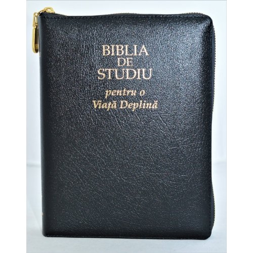 Biblia de studiu pentru o viata deplina, cu concordanta si explicatii, fermoar auriu, neagra, index, margini aurii