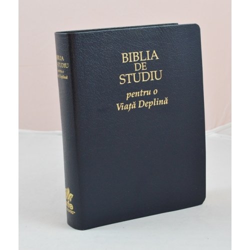 Biblia de studiu pentru o viata deplina are coperta este din piele, de culoare bleumarin, este aurita pe cotor si dispune de index de cautare pe lateral.