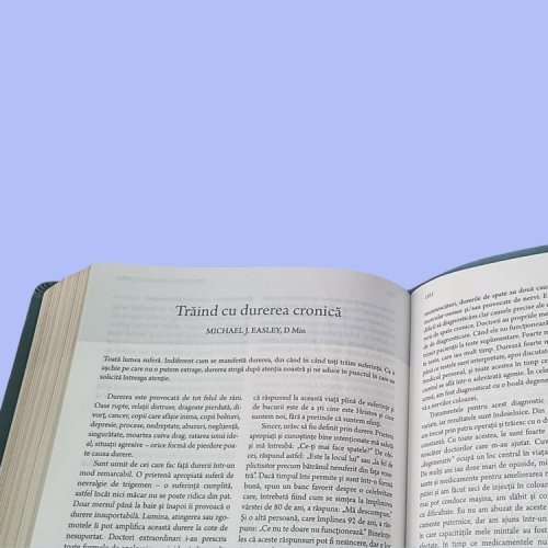 - Devoționale Profunde: Pasaje selectate sunt însoțite de devoționale pe o pagină întreagă, oferind o perspectivă mai profundă și îmbogățită asupra trăirii cu speranță în suferință.