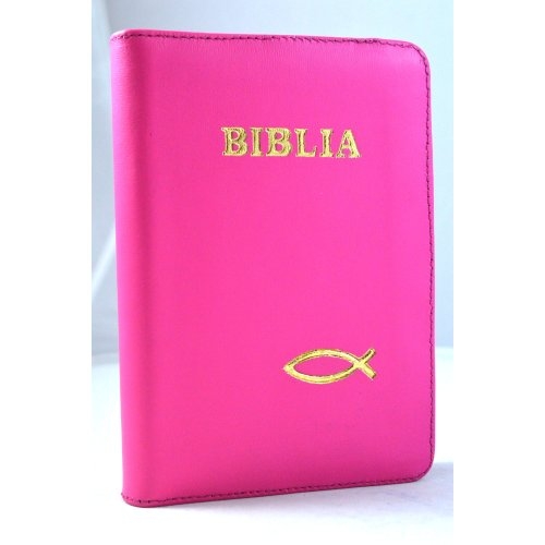 Biblia din piele, marime medie, roz bombon, fermoar, cu peste, cuv. lui Isus cu rosu [053]