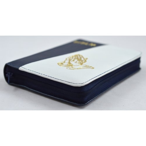 Biblia din piele, bleumarin inchis / alb, dimensiune mica, fermoar, cu maini in ruga, cuv. lui Isus cu rosu [043]