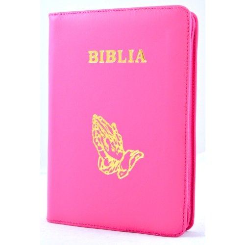 Biblia din piele, marime medie, roz bombon, fermoar, margini aurite, simbol maini in ruga, cuv. lui Isus cu rosu [052]