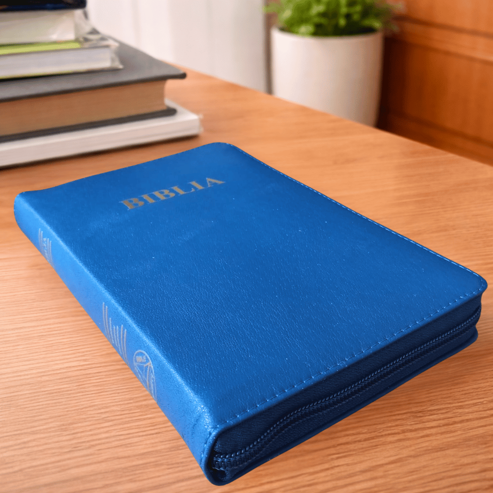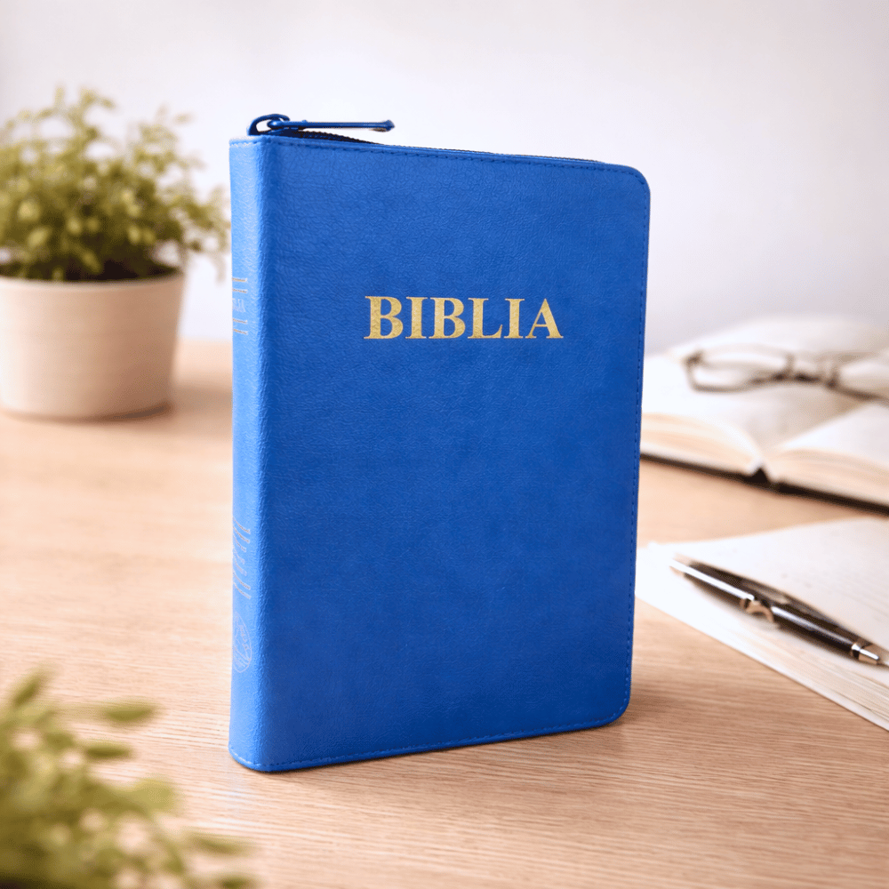 Biblia din piele ecologica, marime medie, albastru regal, fermoar, index pe cotor, margini aurii, cuv. lui Isus in rosu [057 ZTI]